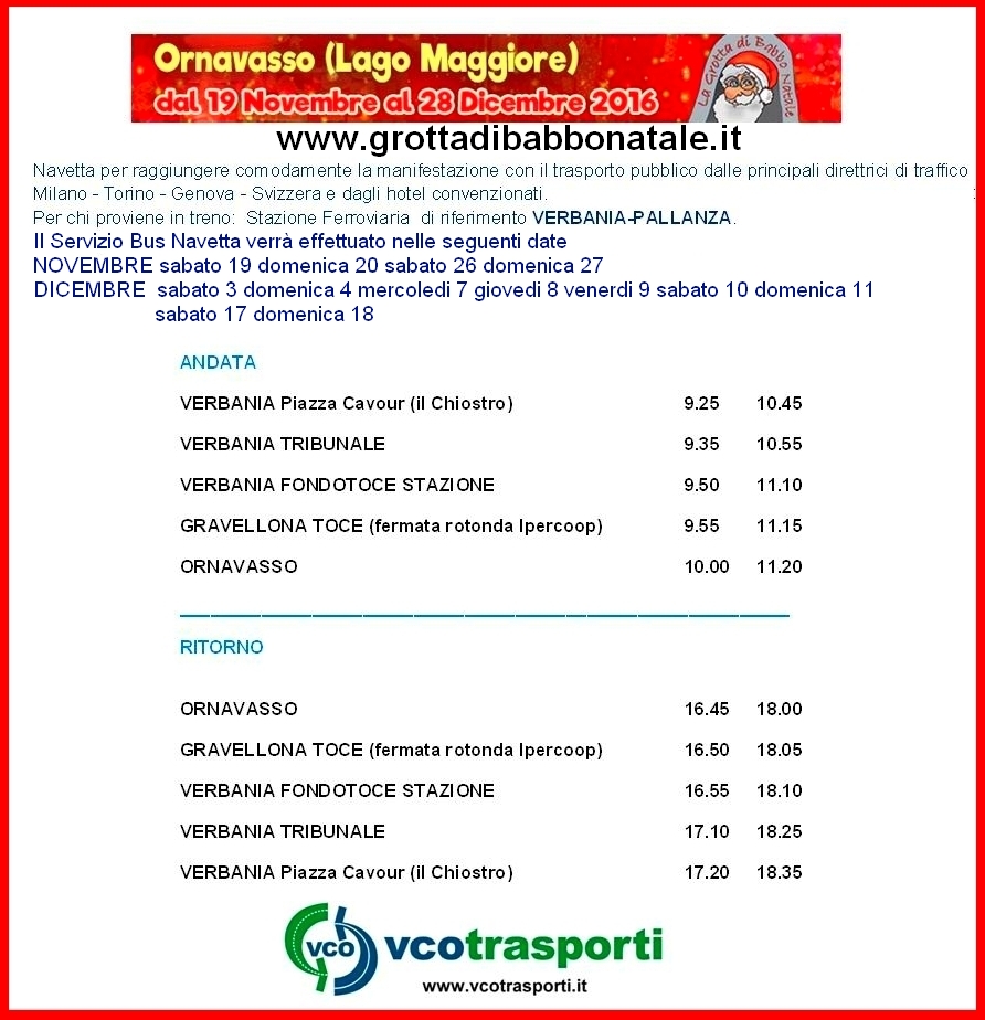 BUS NAVETTA PER ORNAVASSO, NOVEMBRE E DICEMBRE 2016