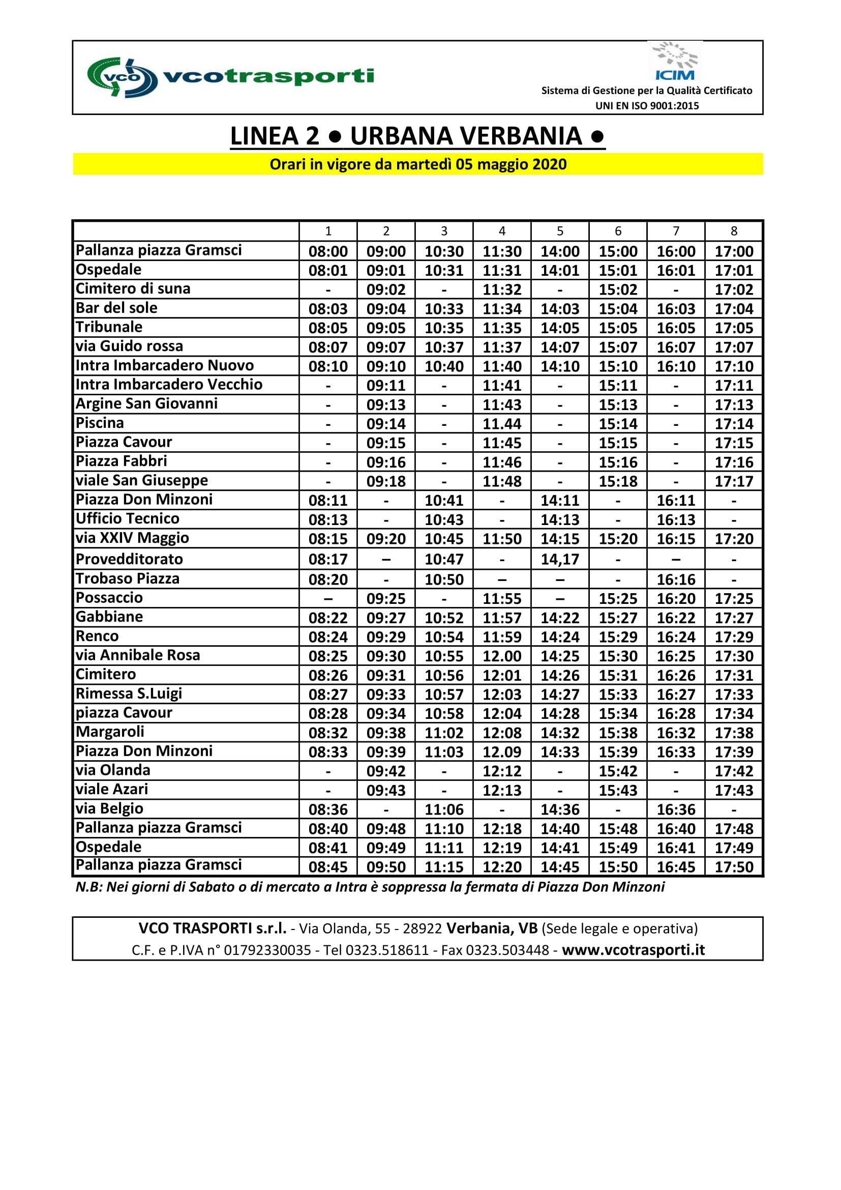 Si informano gli Utenti che la linea URBANA di VERBANIA sarà ripristinata dal 5 maggio 2020 osservando il seguente orario: